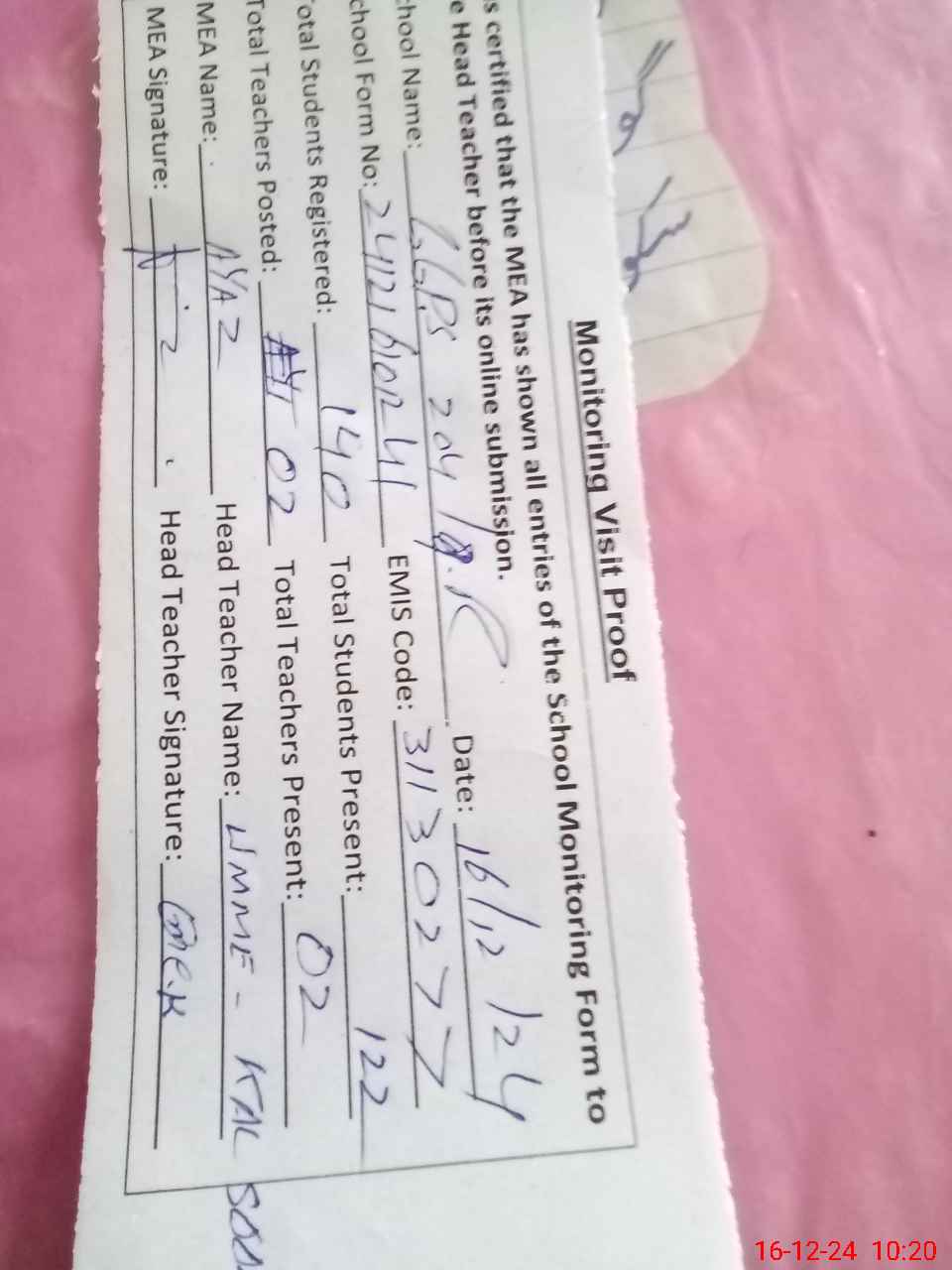| Attendance Register | Head Teacher | MEA with School | Visit Proof |