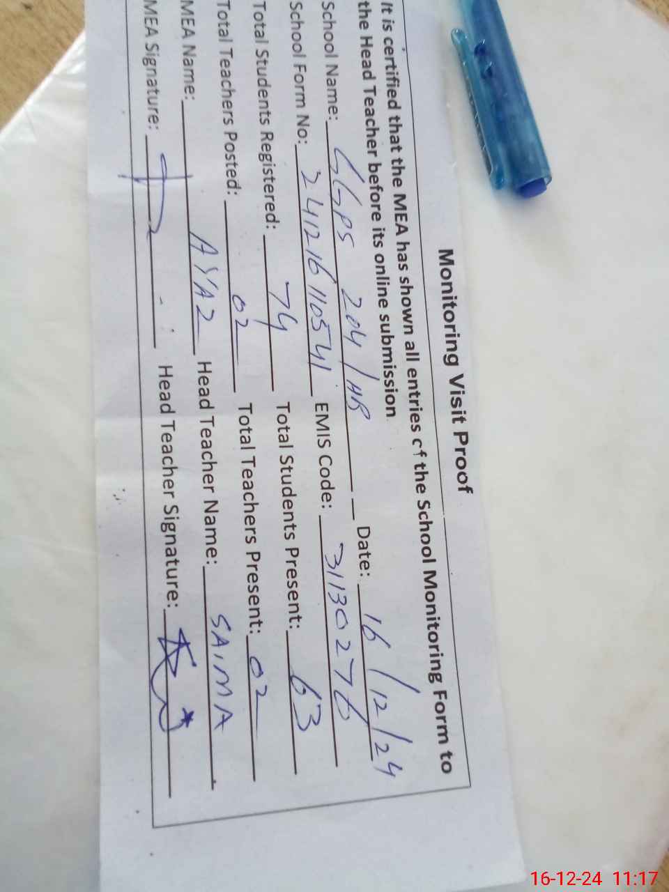 | EMIS Code: 31130276 | Name of School: GGPS CHAK NO 204 HB | |||
