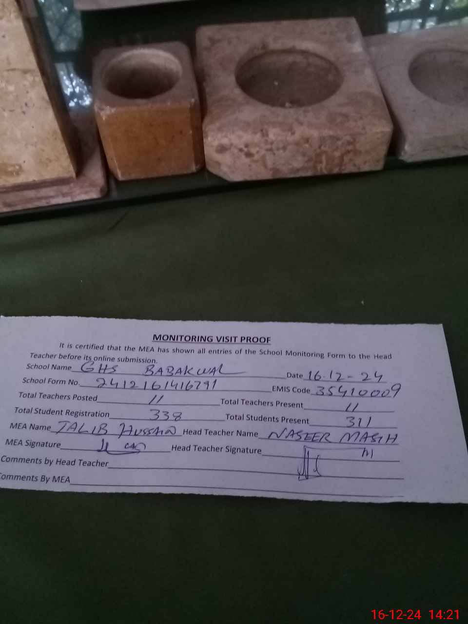 | Attendance Register | Head Teacher | MEA with School | Visit Proof |