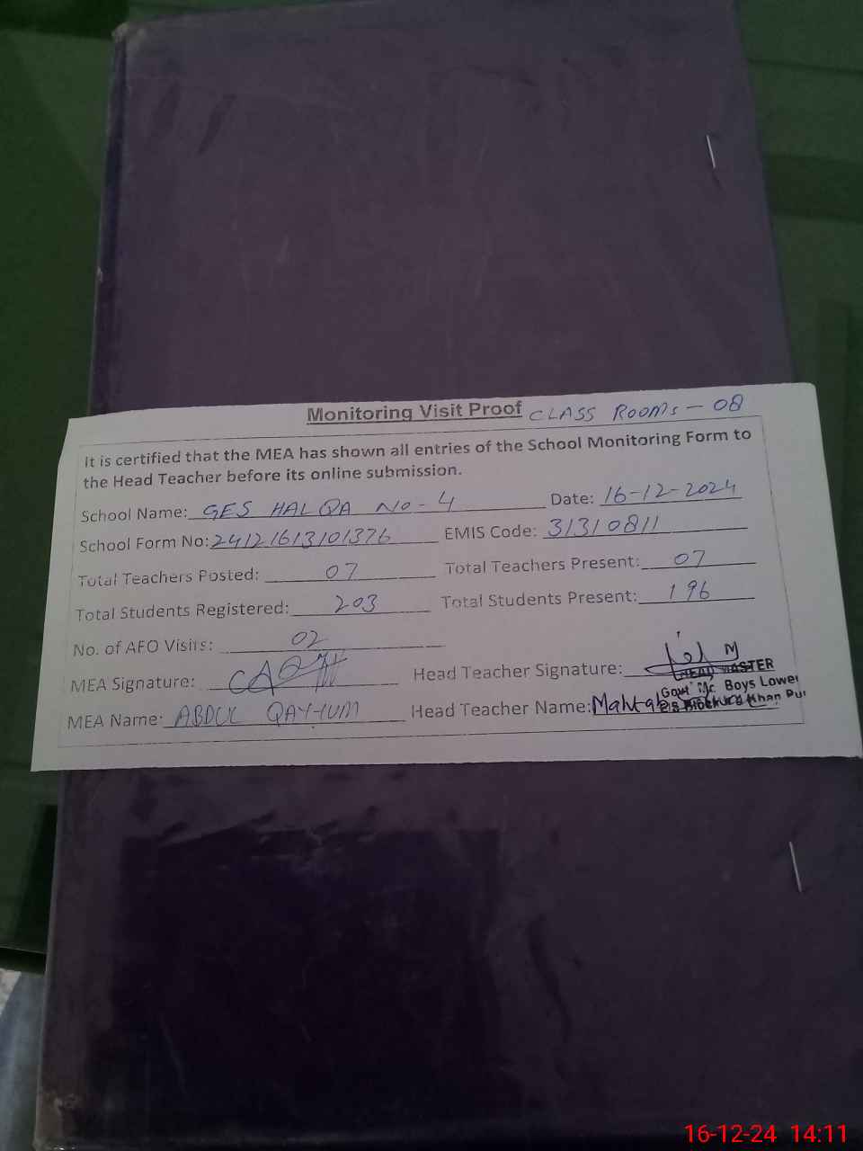 | EMIS Code: 31310811 | Name of School: GES HALQA NO 4 | |||