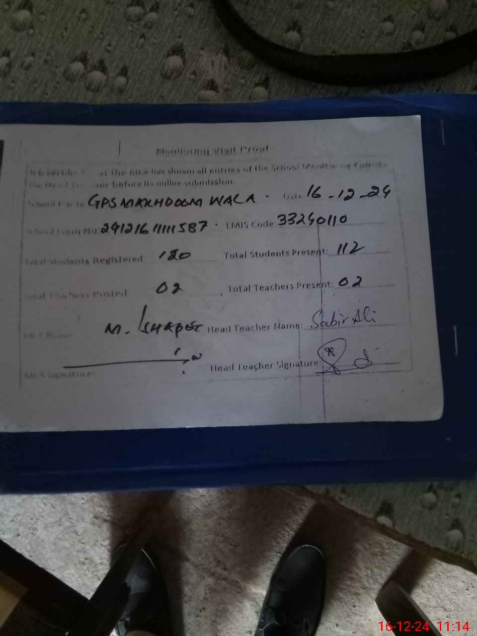 | Attendance Register | Head Teacher | MEA with School | Visit Proof |