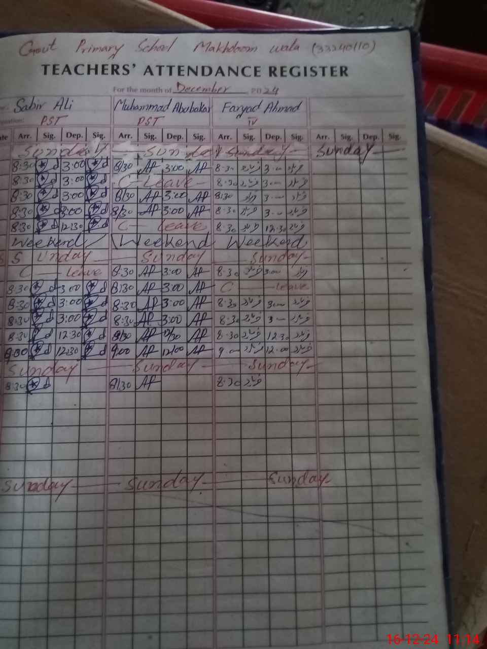 | CNIC | Full Name | Designation | R/C | Absence during last cal. month |