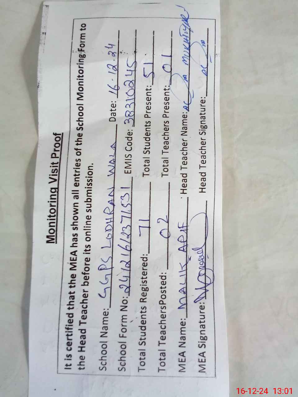 | EMIS Code: 38310245 | Name of School: GGPS LODHRAN WALA | |||