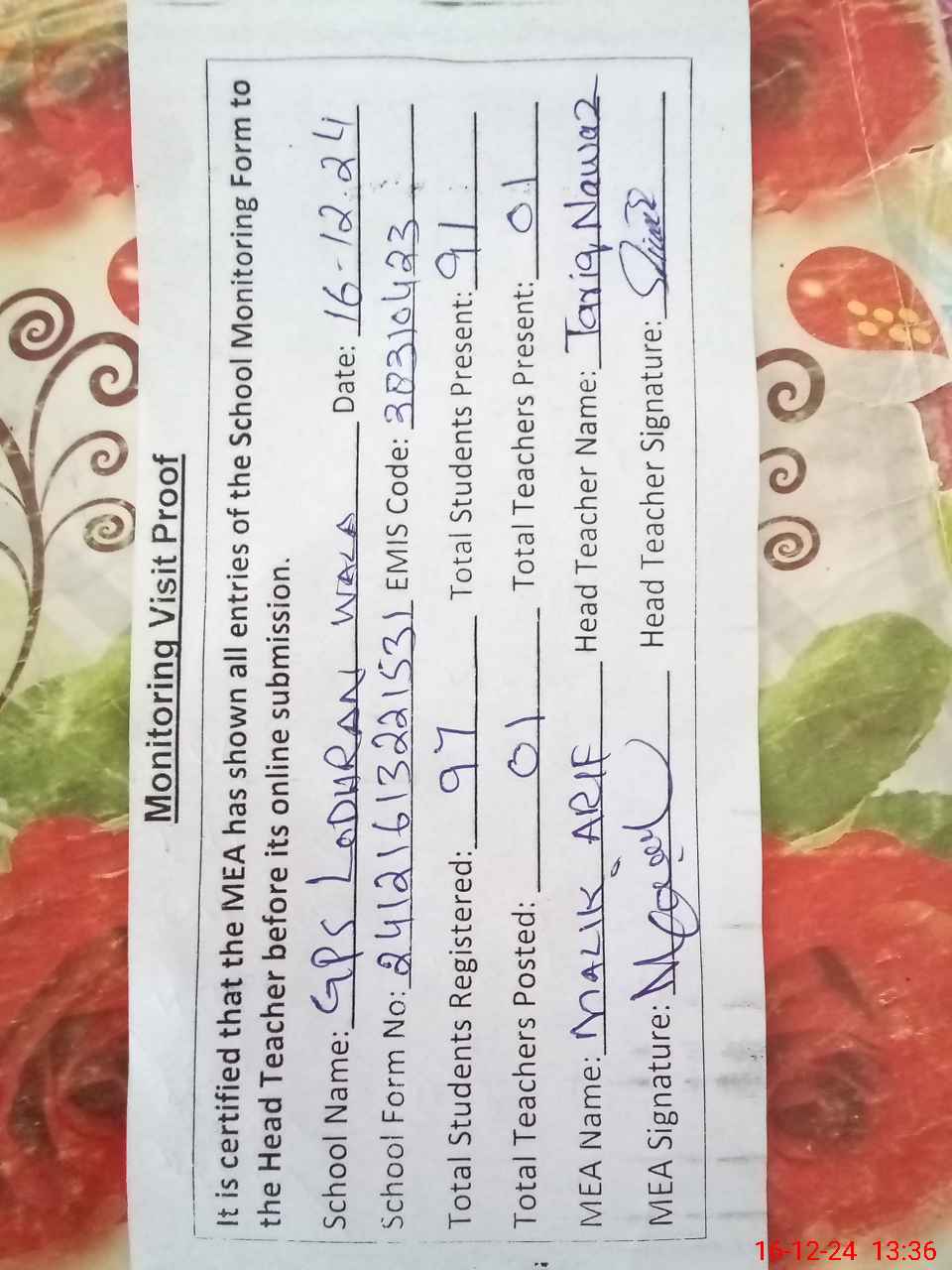 | EMIS Code: 38310423 | Name of School: GPS LODHRAN WALA | |||