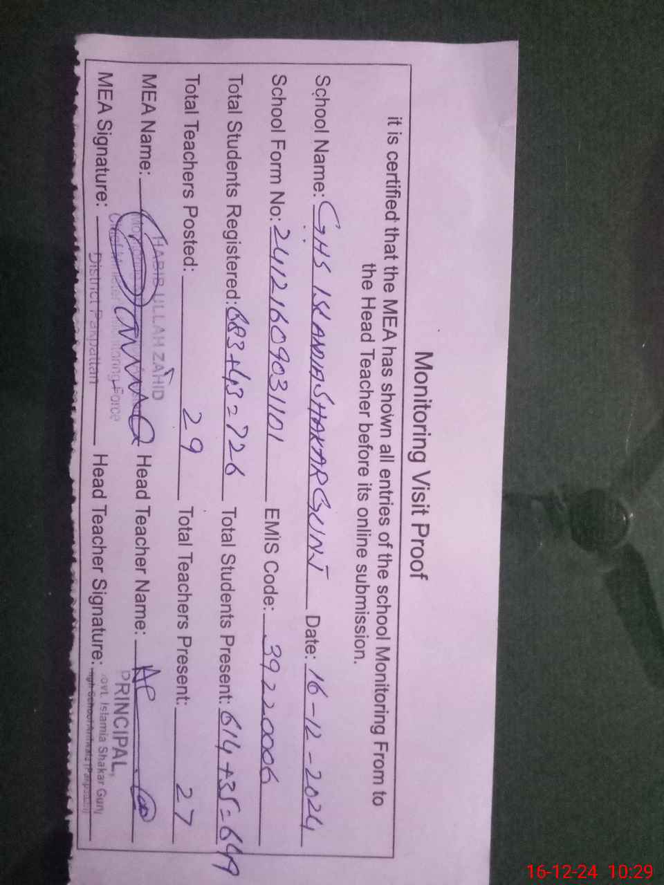 | Attendance Register | Head Teacher | MEA with School | Visit Proof |