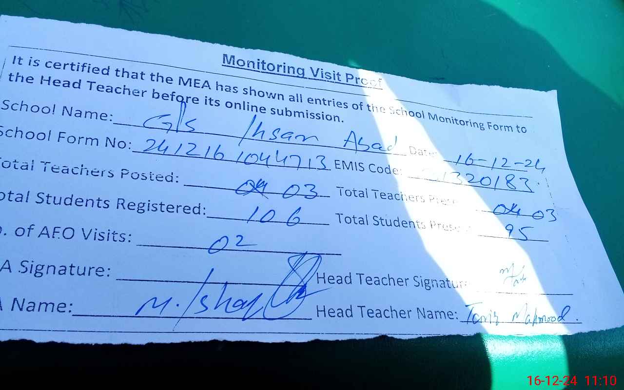 | EMIS Code: 31320183 | Name of School: GPS IHSAN ABAD | |||