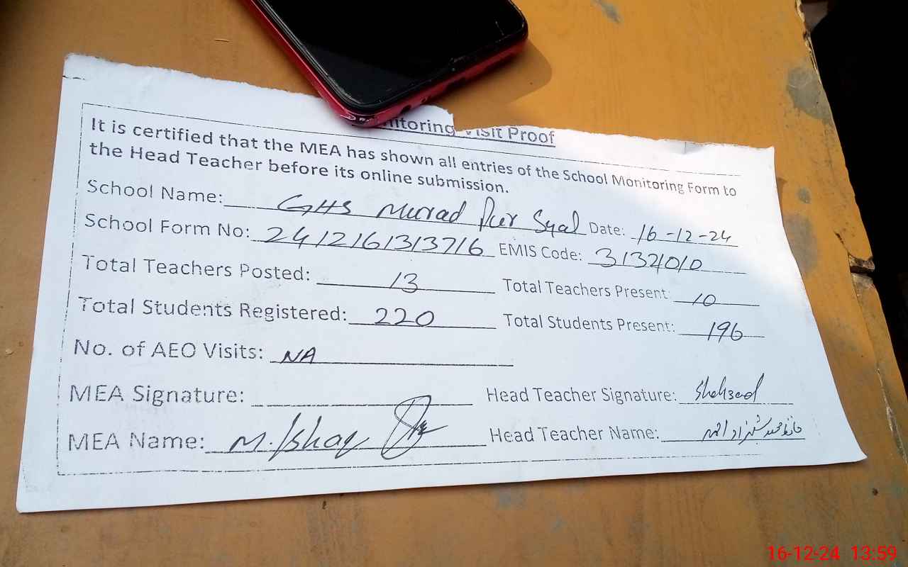 | EMIS Code: 31321010 | Name of School: GHS MURAD PUR SIAL | |||