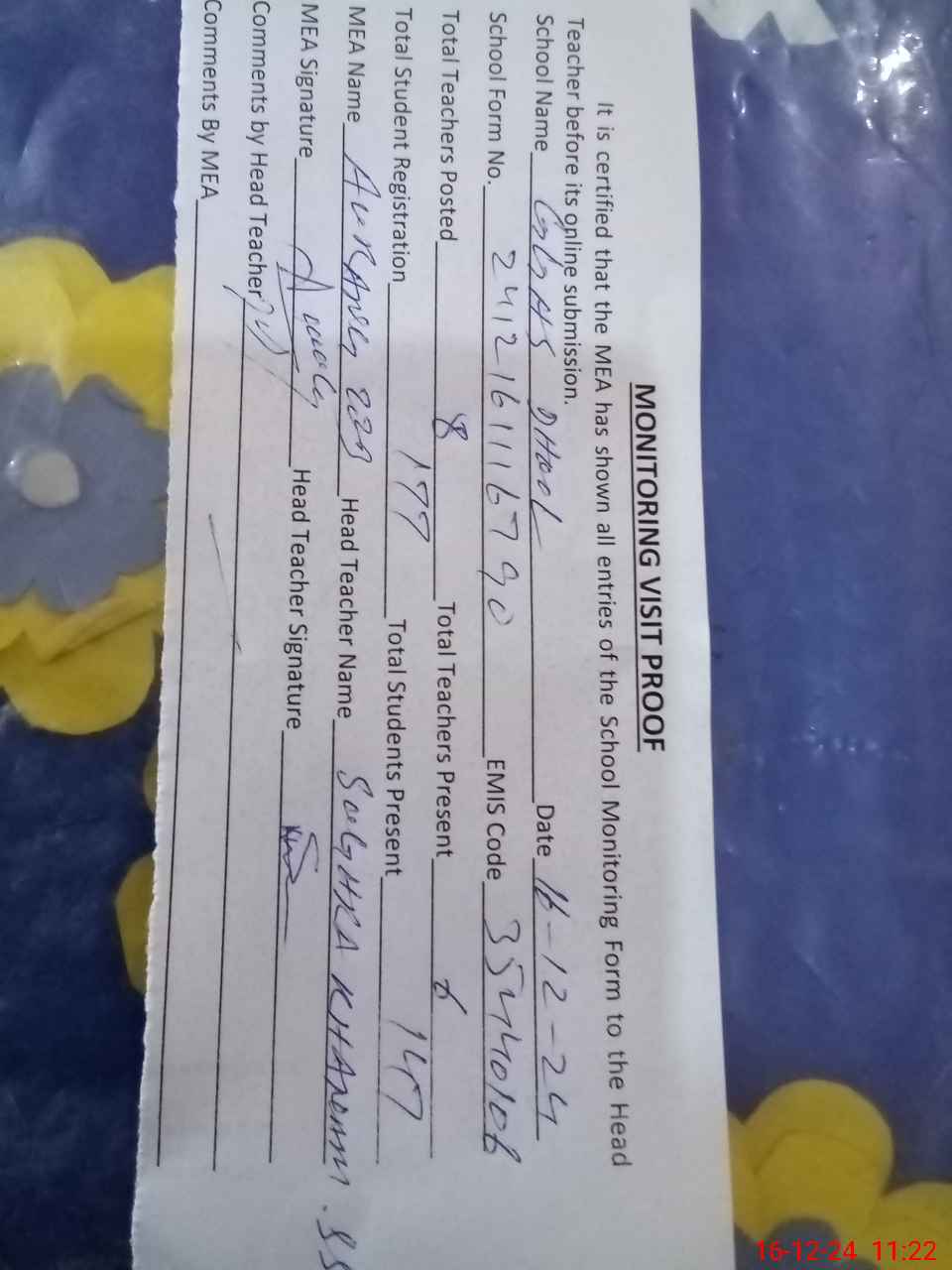 | Certified that this School was Inspected by the Undersigned MEA/DMO Today and the Information Stated Above is as Per Record. | |||||
