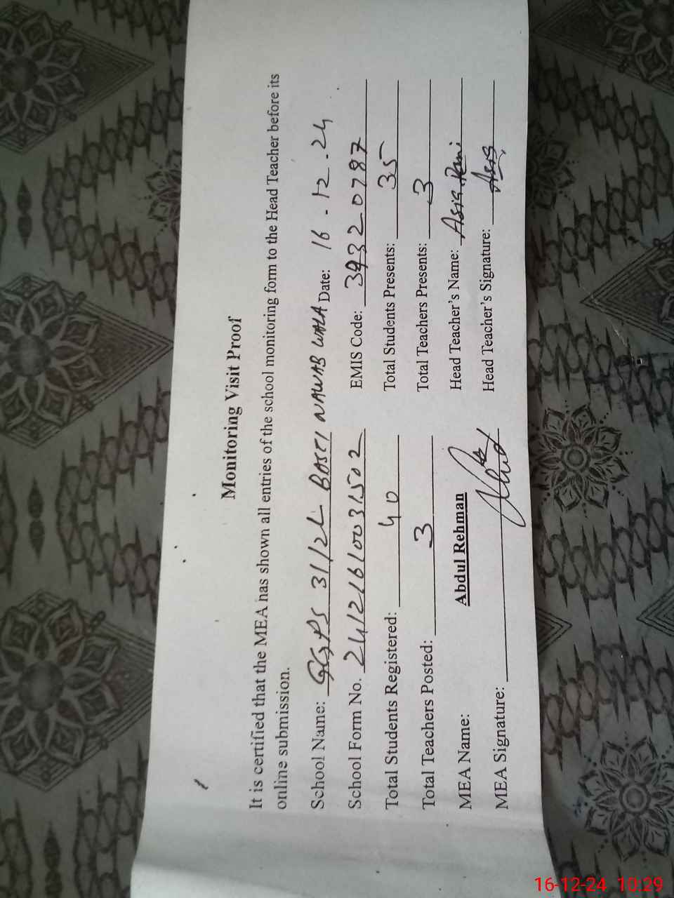 | Attendance Register | Head Teacher | MEA with School | Visit Proof |