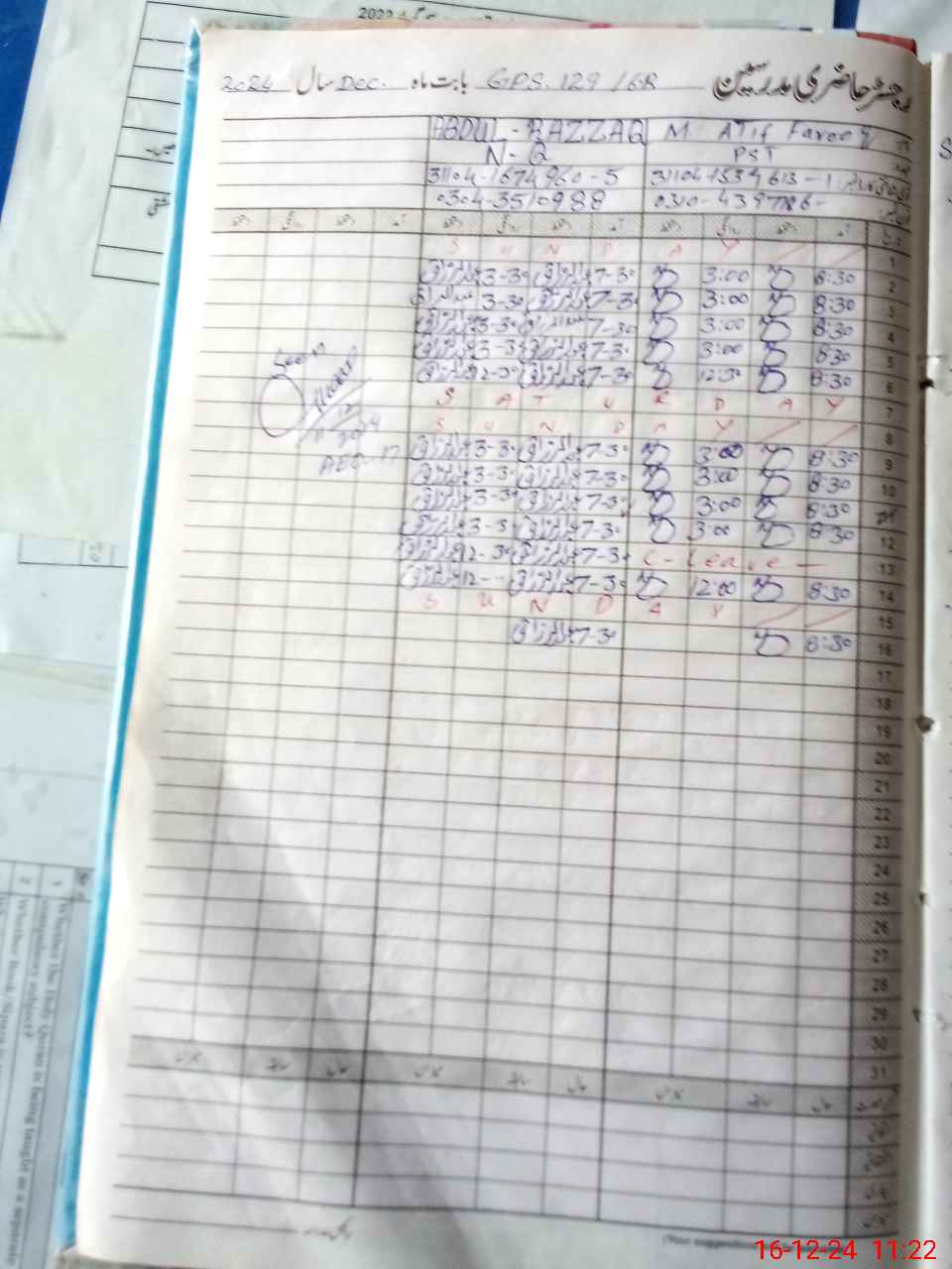 | CNIC | Full Name | Designation | R/C | Absence During Last Calender Month |