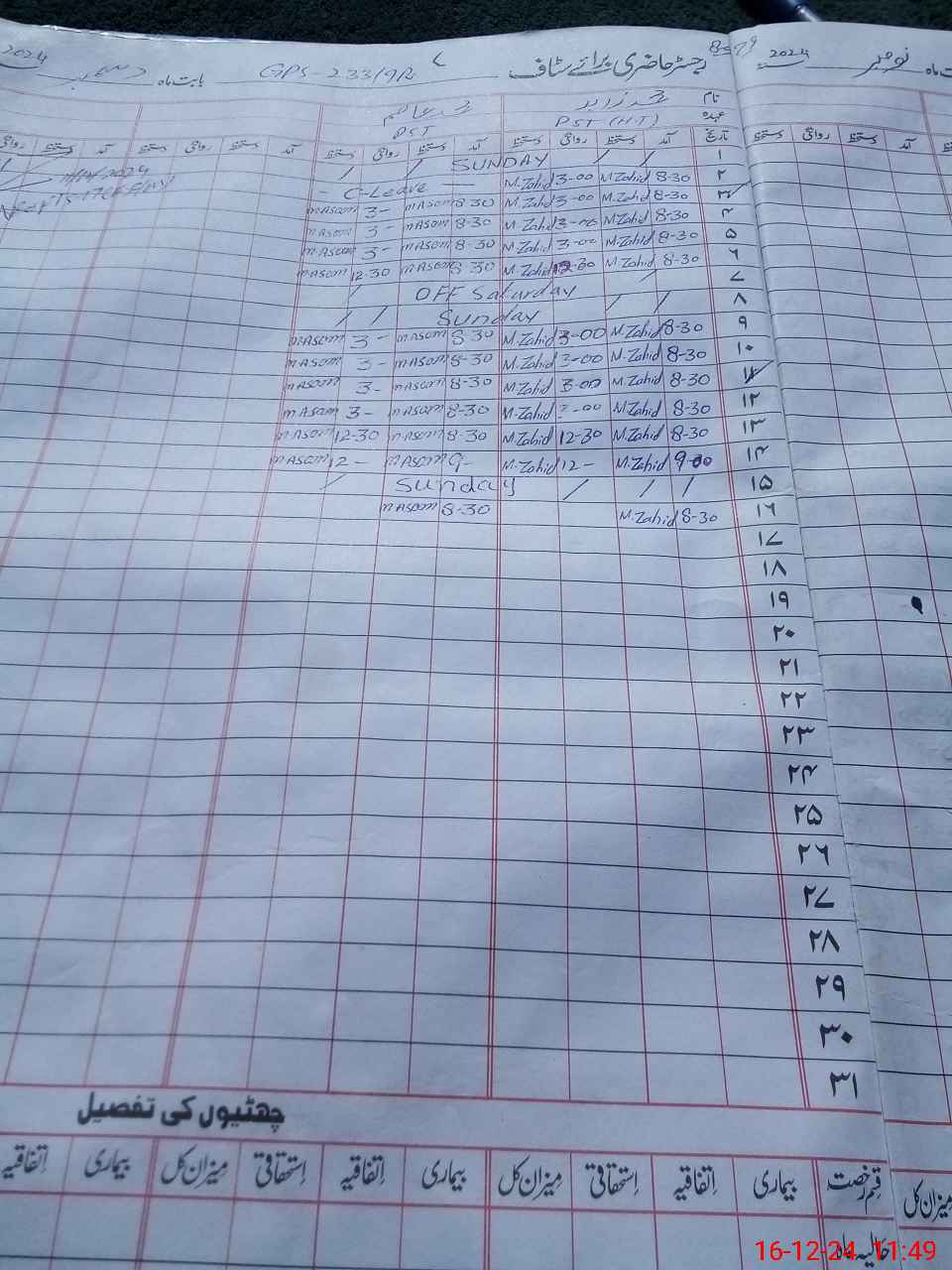| CNIC | Full Name | Designation | R/C | Absence During Last Calender Month |