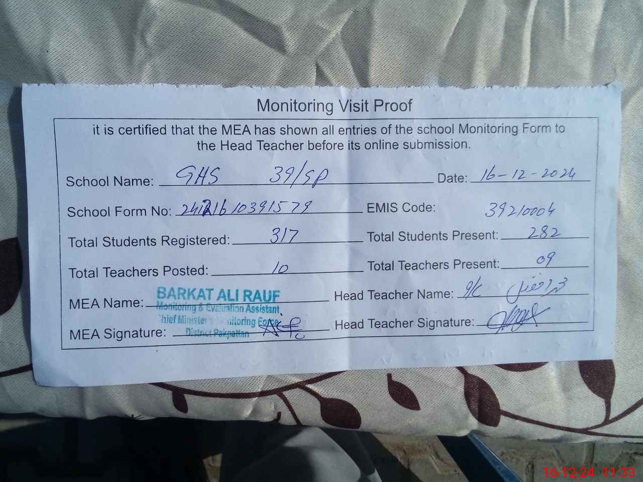 | EMIS Code: 39210004 | Name of School: GHS 39/S.P | |||