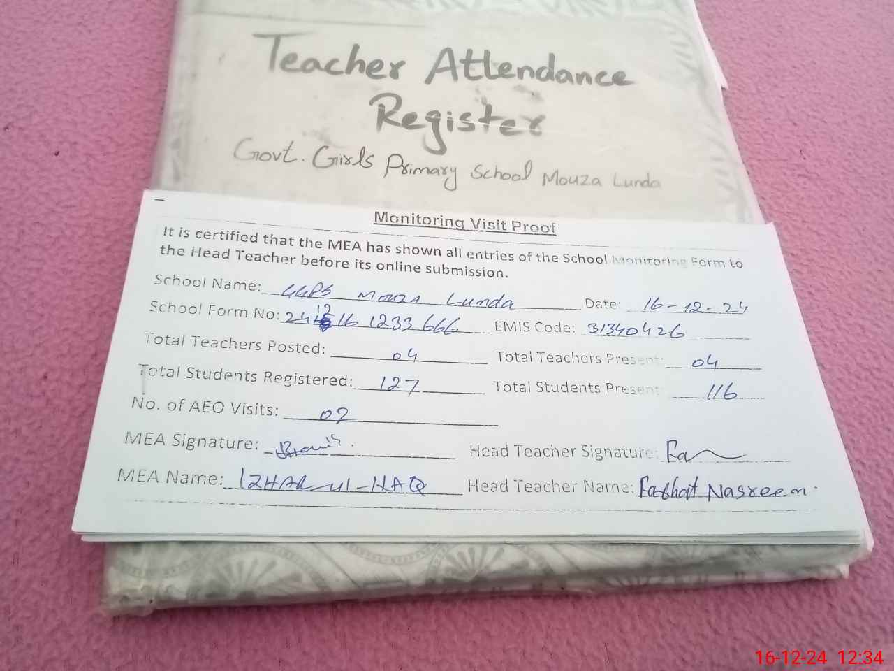 | Attendance Register | Head Teacher | MEA with School | Visit Proof |