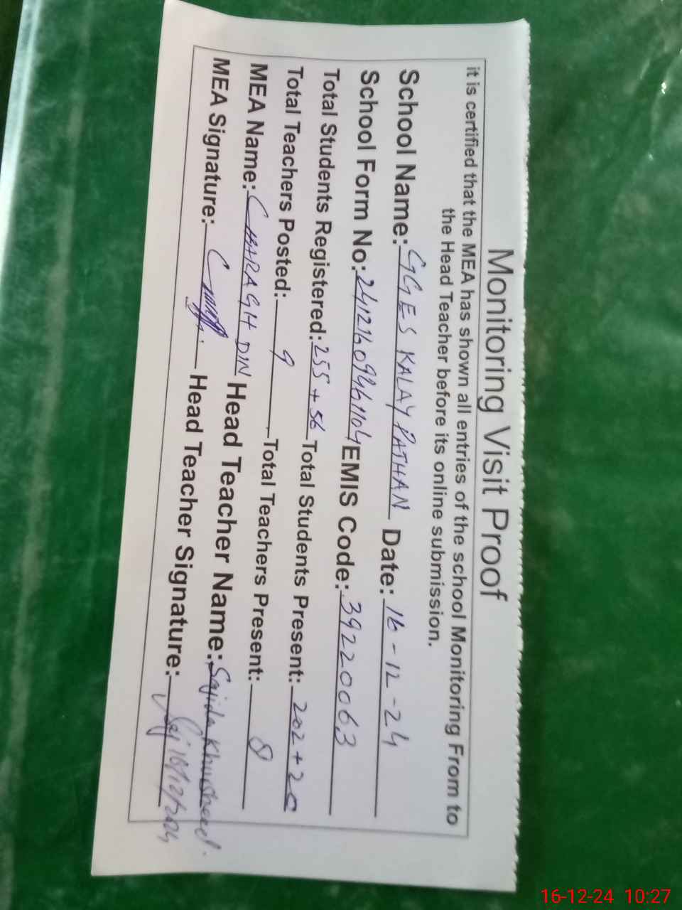 | EMIS Code: 39220063 | Name of School: GGES KALAY PATHAN | |||