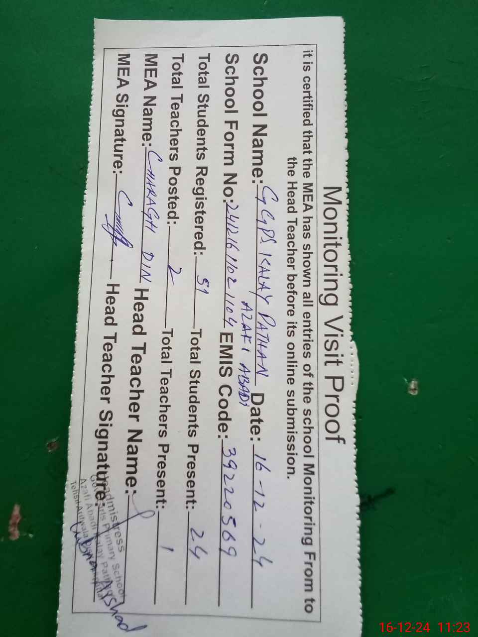 | EMIS Code: 39220569 | Name of School: GGPS KALAY PATHAN AZAFI ABADI | |||