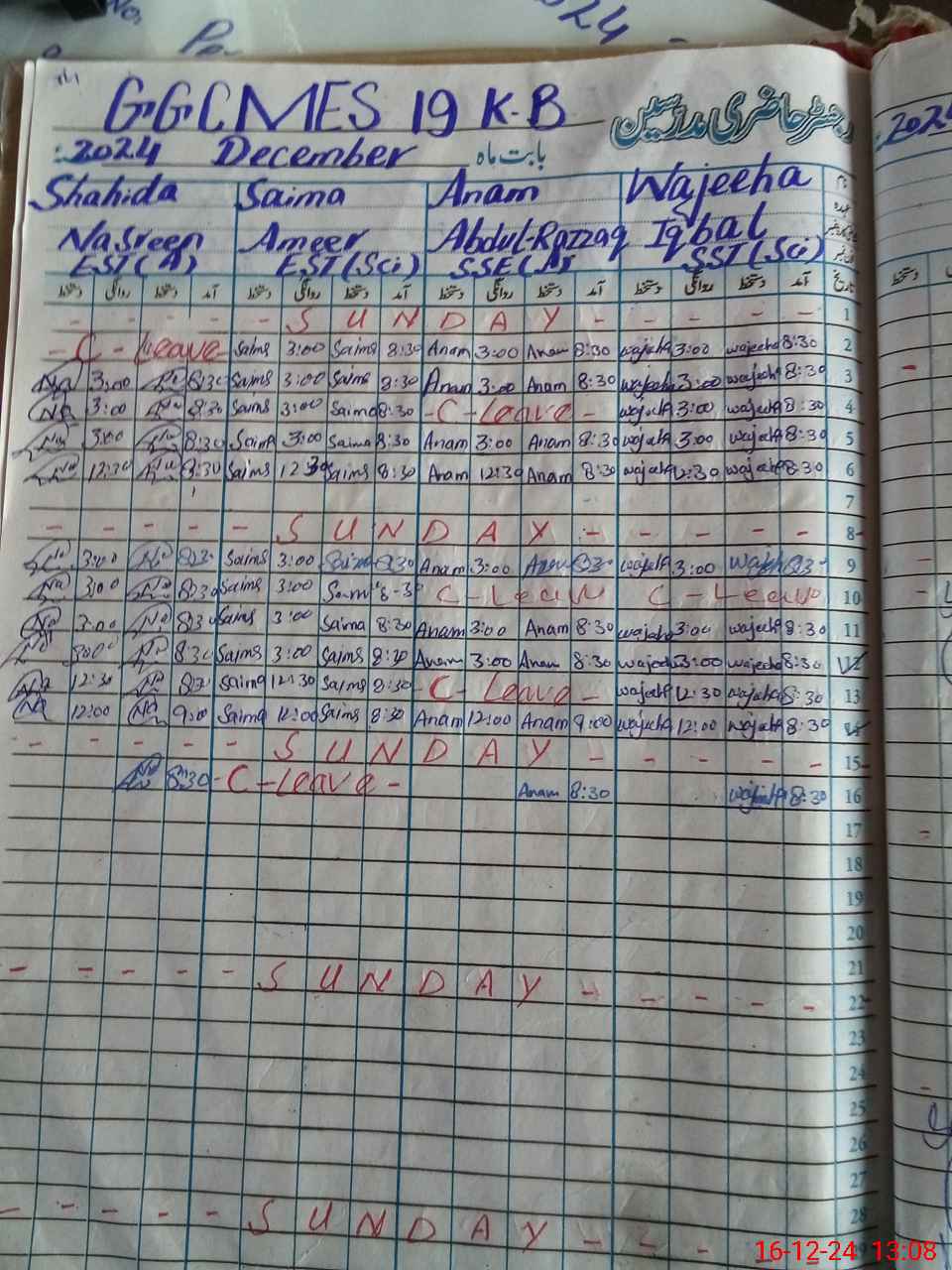| CNIC | Full Name | Designation | R/C | Absence During Last Calender Month |