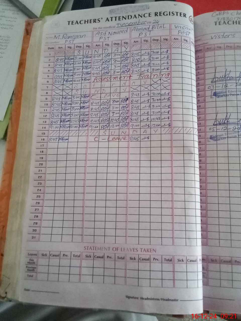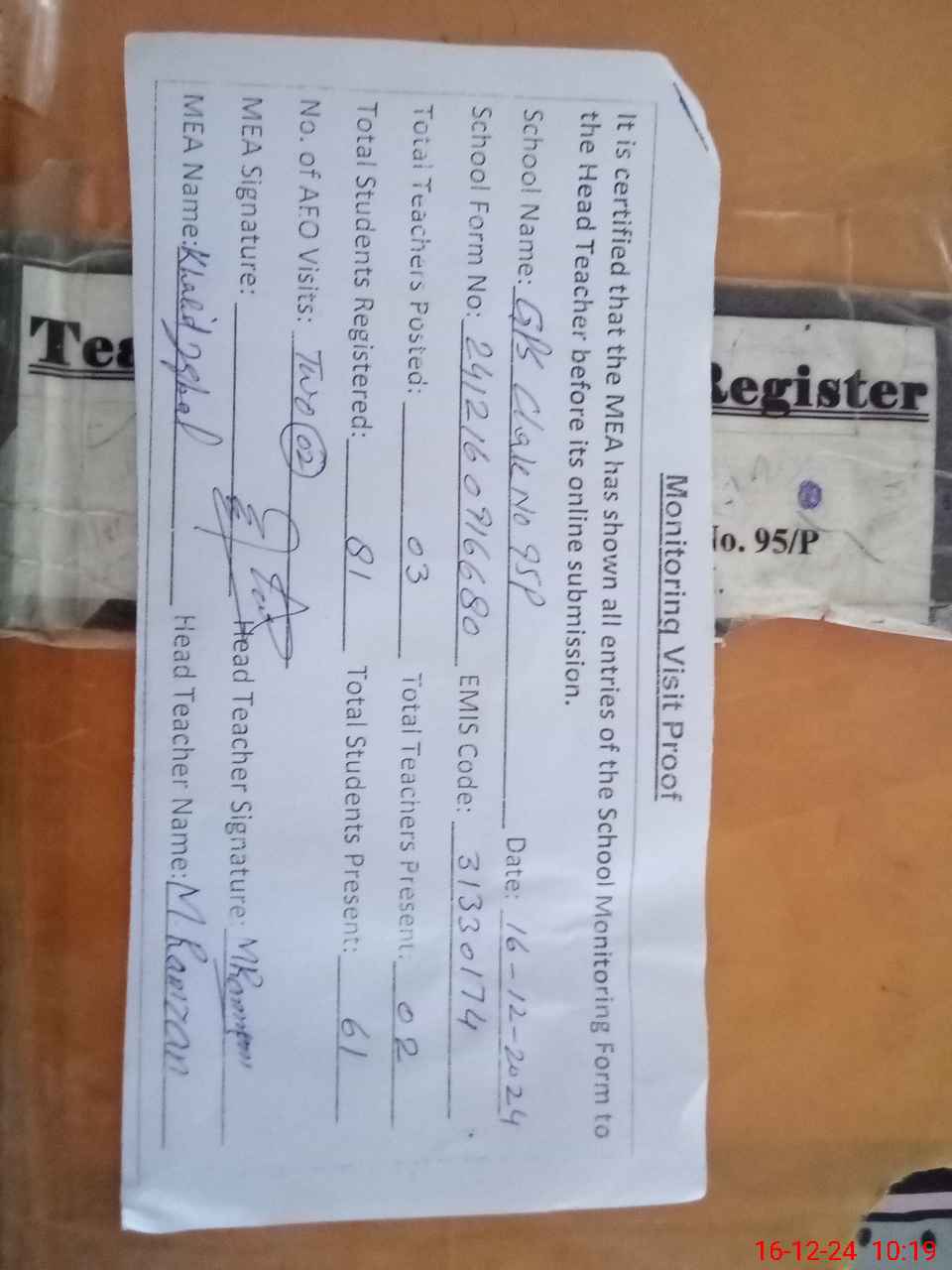 | Attendance Register | Head Teacher | MEA with School | Visit Proof |
