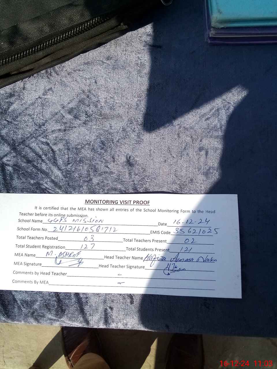 | Attendance Register | Head Teacher | MEA with School | Visit Proof |