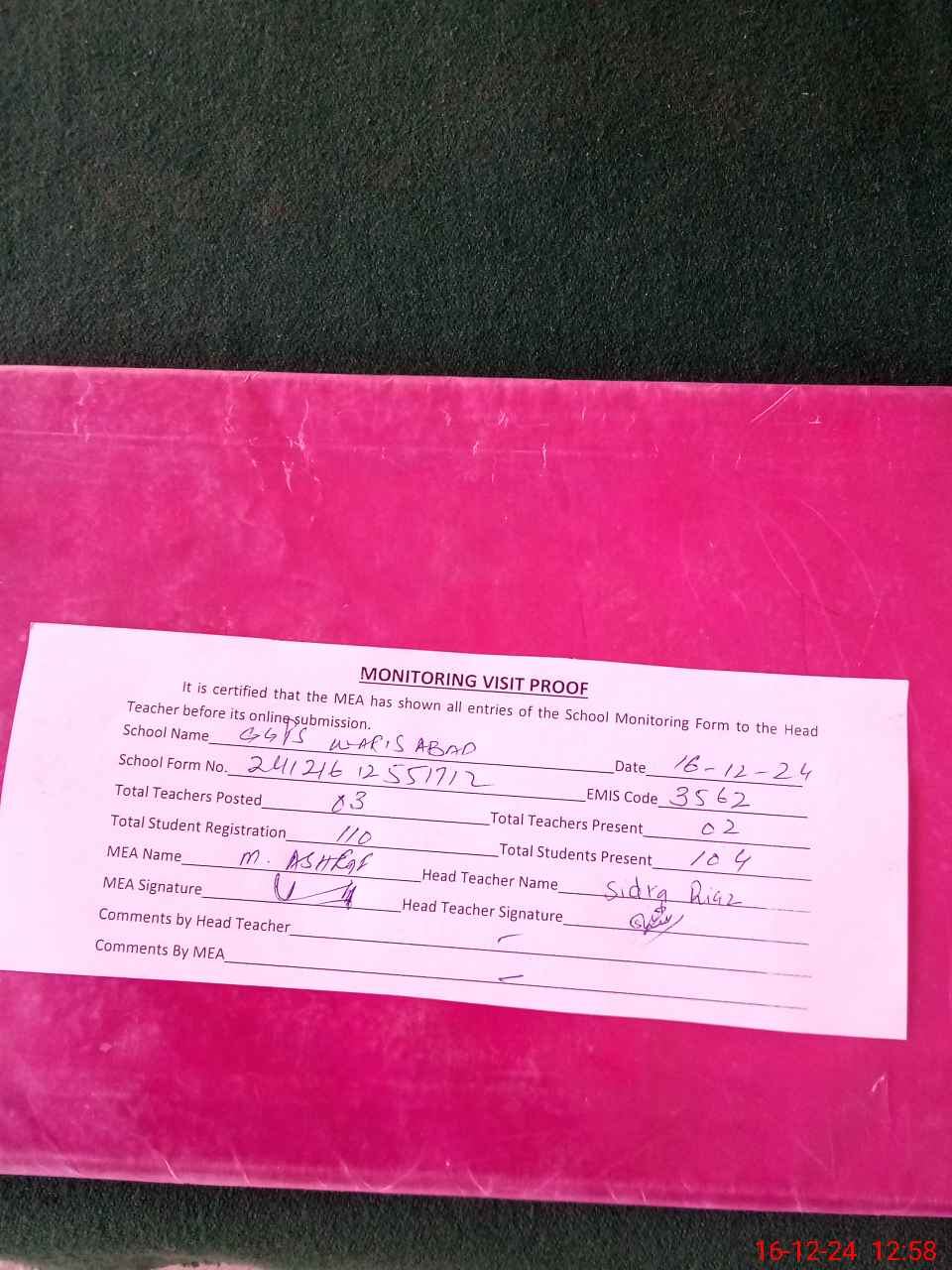 | EMIS Code: 35620815 | Name of School: GGPS WARIS ABAD CHAK 20 RB | |||