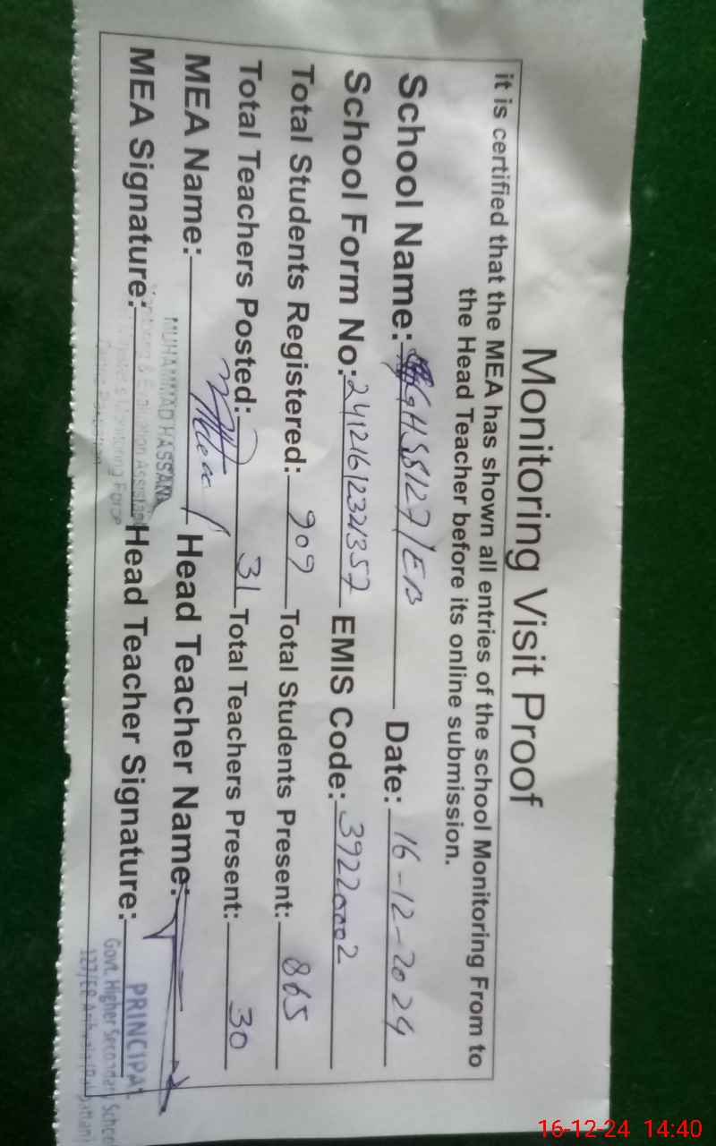 | EMIS Code: 39220002 | Name of School: GHSS 127/EB ARIFWALA | |||