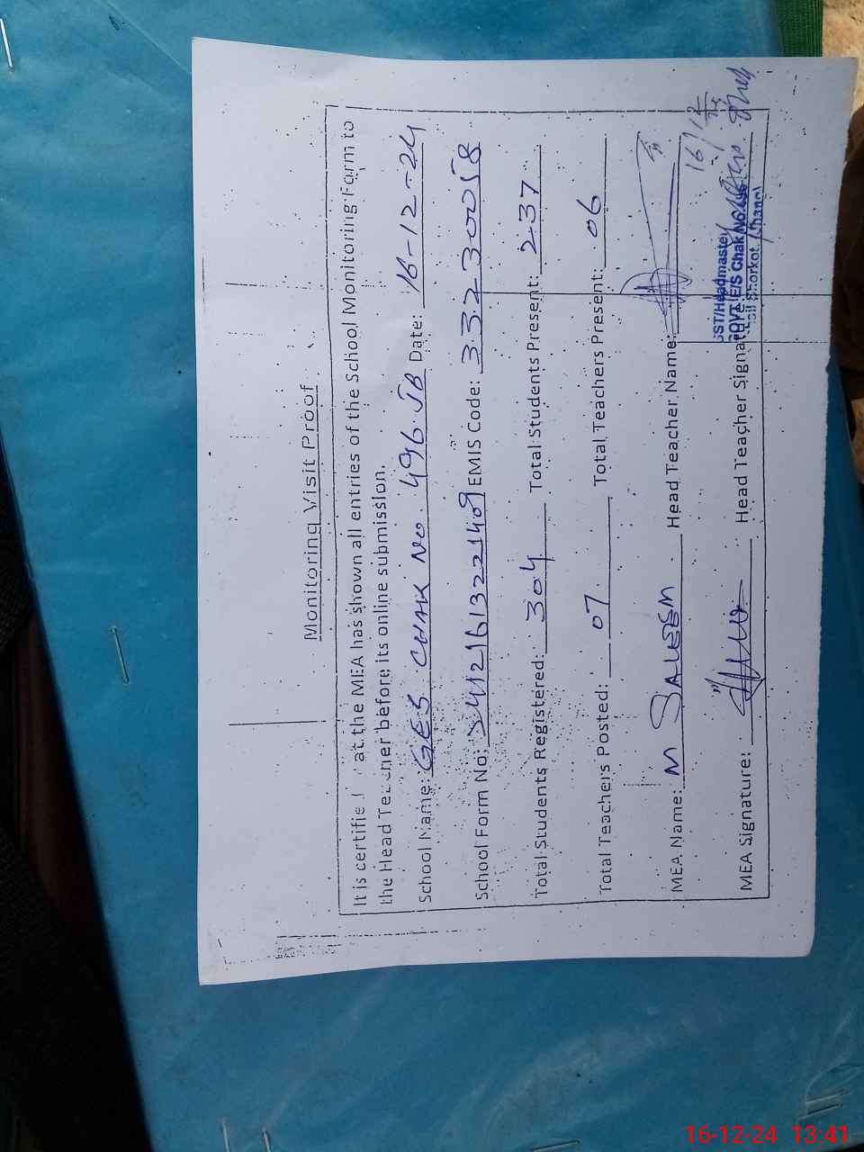 | Attendance Register | Head Teacher | MEA with School | Visit Proof |