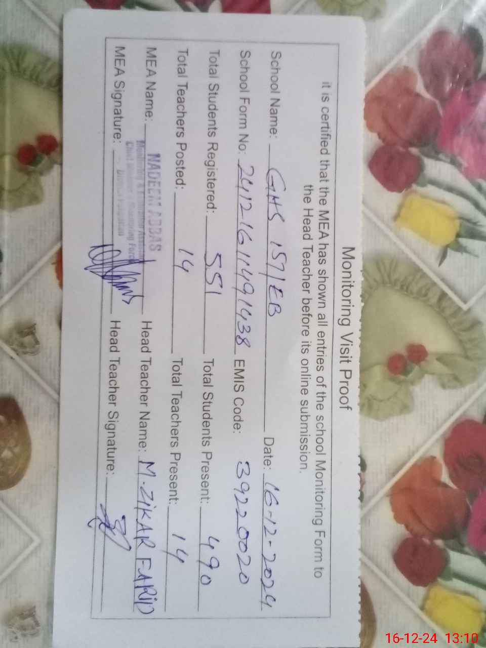 | Attendance Register | Head Teacher | MEA with School | Visit Proof |
