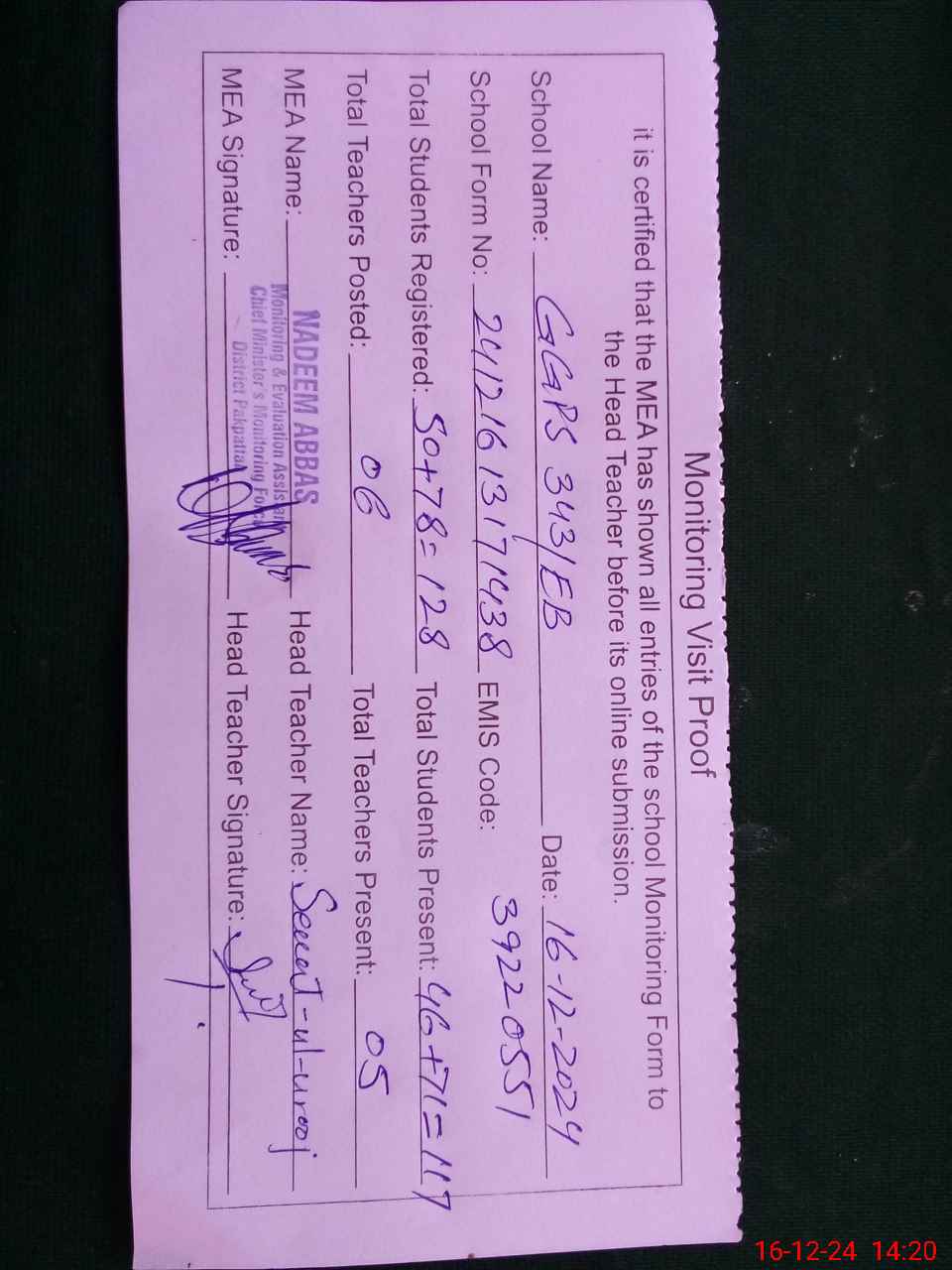 | Attendance Register | Head Teacher | MEA with School | Visit Proof |