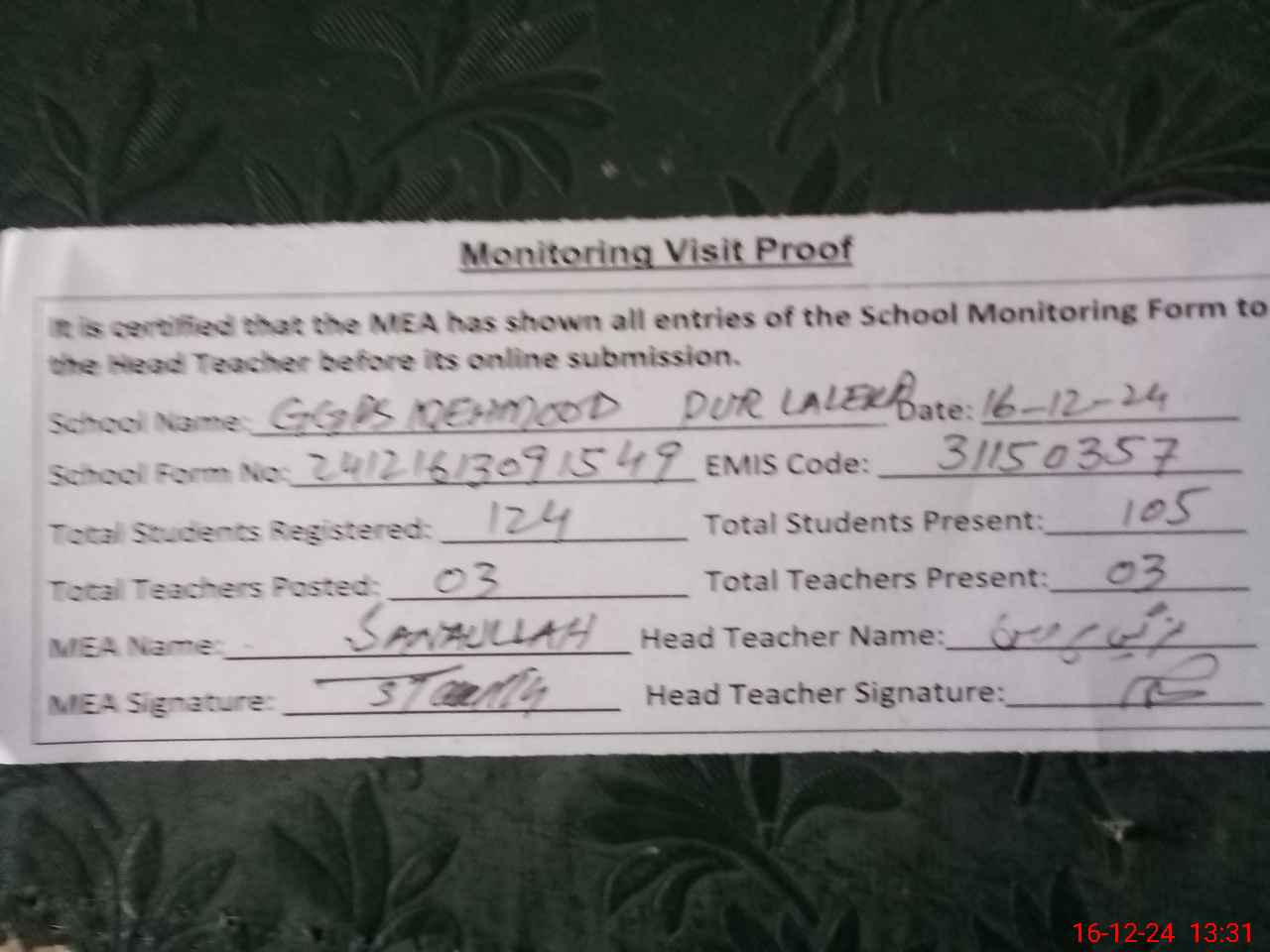 | EMIS Code: 31150357 | Name of School: GGPS MEHMOOD PUR LALAKEKA | |||