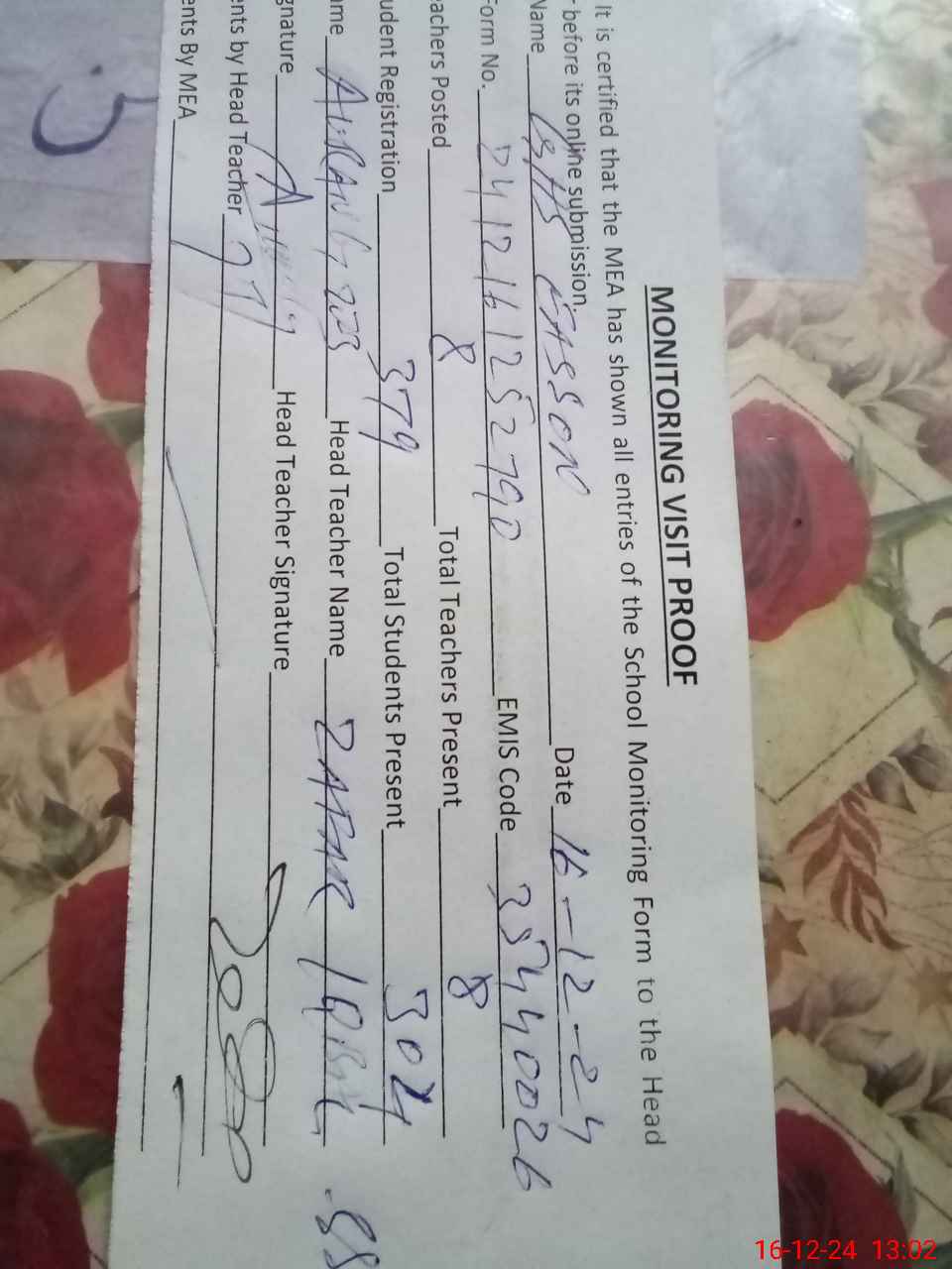 | Attendance Register | Head Teacher | MEA with School | Visit Proof |