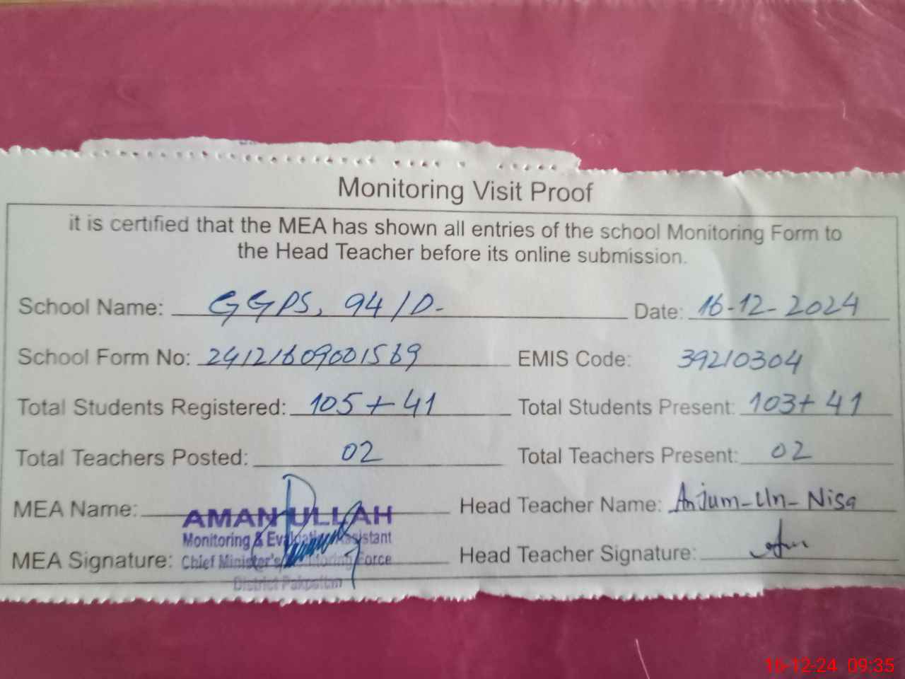 | Attendance Register | Head Teacher | MEA with School | Visit Proof |