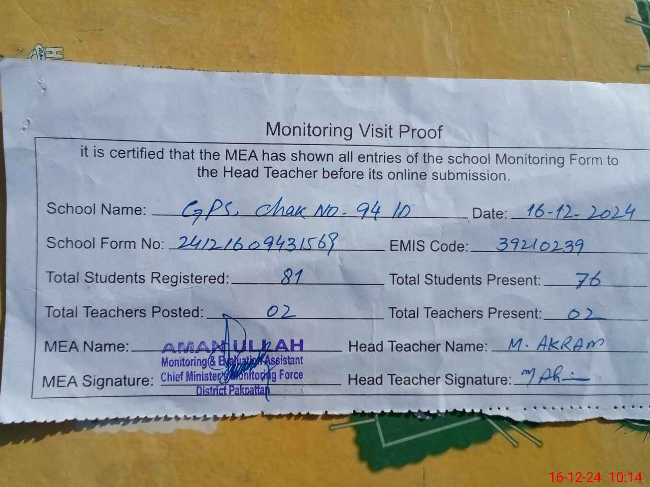 | Attendance Register | Head Teacher | MEA with School | Visit Proof |