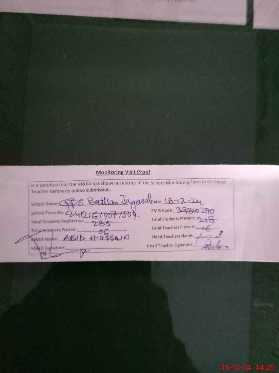 | EMIS Code: 39310270 | Name of School: GPS BATTIAN RAJOWAL | |||