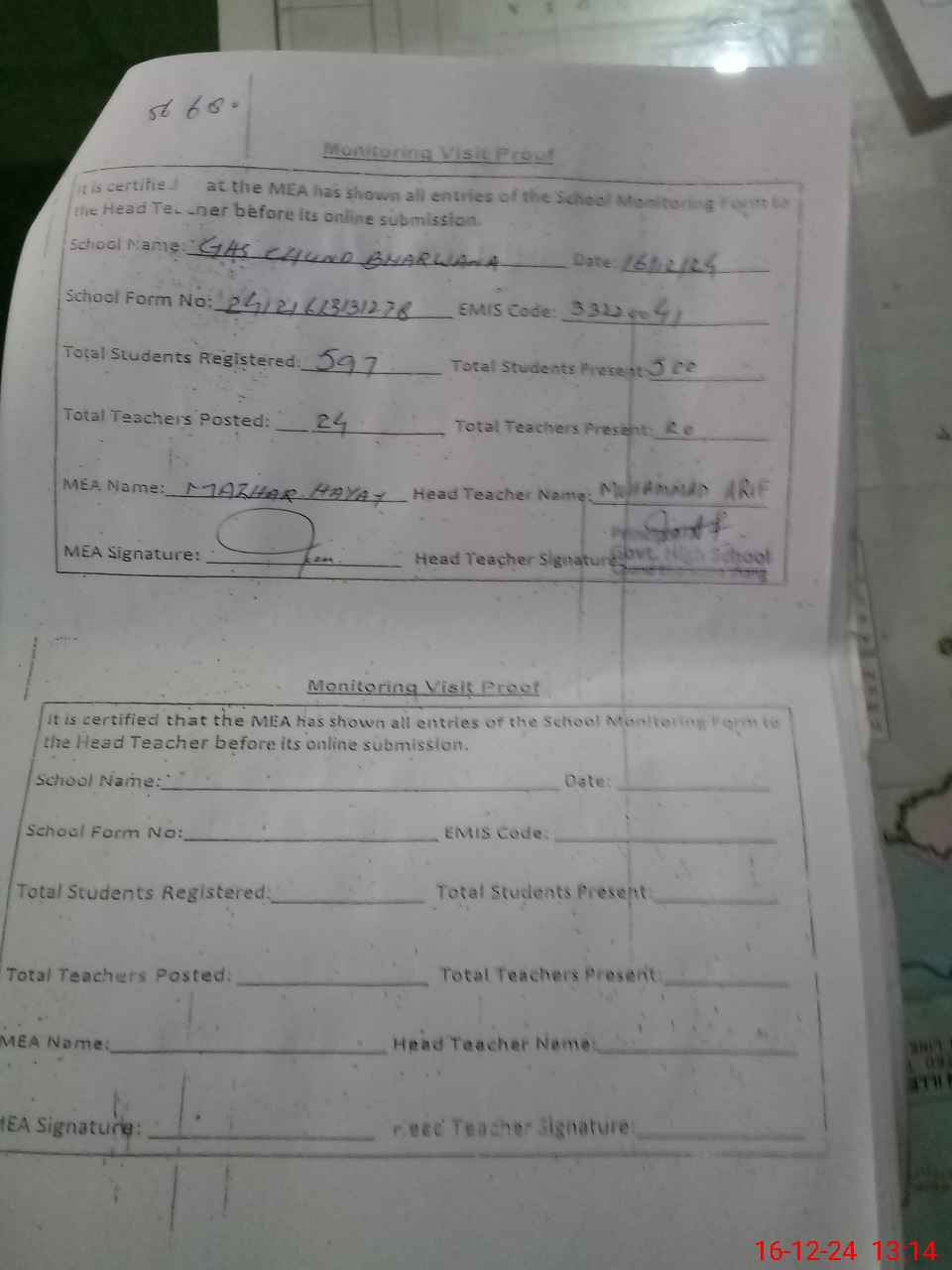 | Certified that this School was Inspected by the Undersigned MEA/DMO Today and the Information Stated Above is as Per Record. | |||||