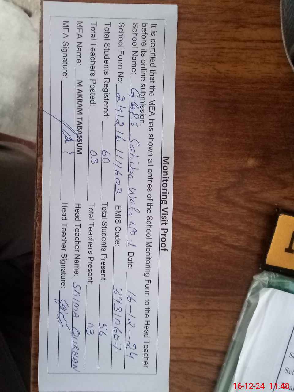 | EMIS Code: 39310607 | Name of School: GGPS SAHIBA WALA NO. 1 | |||