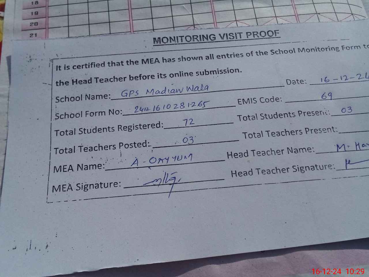 | Attendance Register | Head Teacher | MEA with School | Visit Proof |