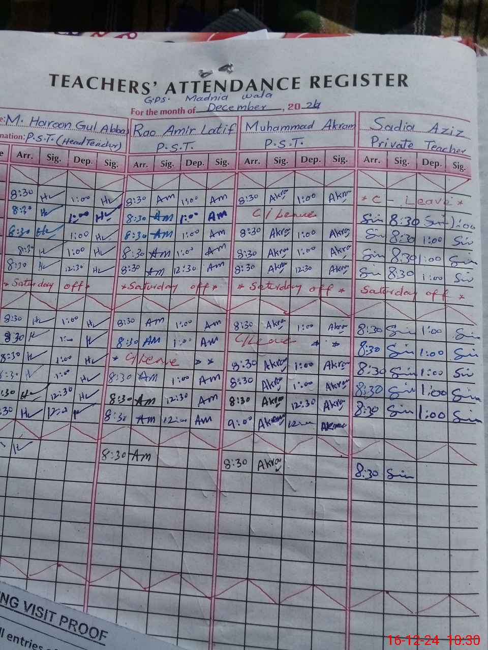 | CNIC | Full Name | Designation | R/C | Absence During Last Calender Month |