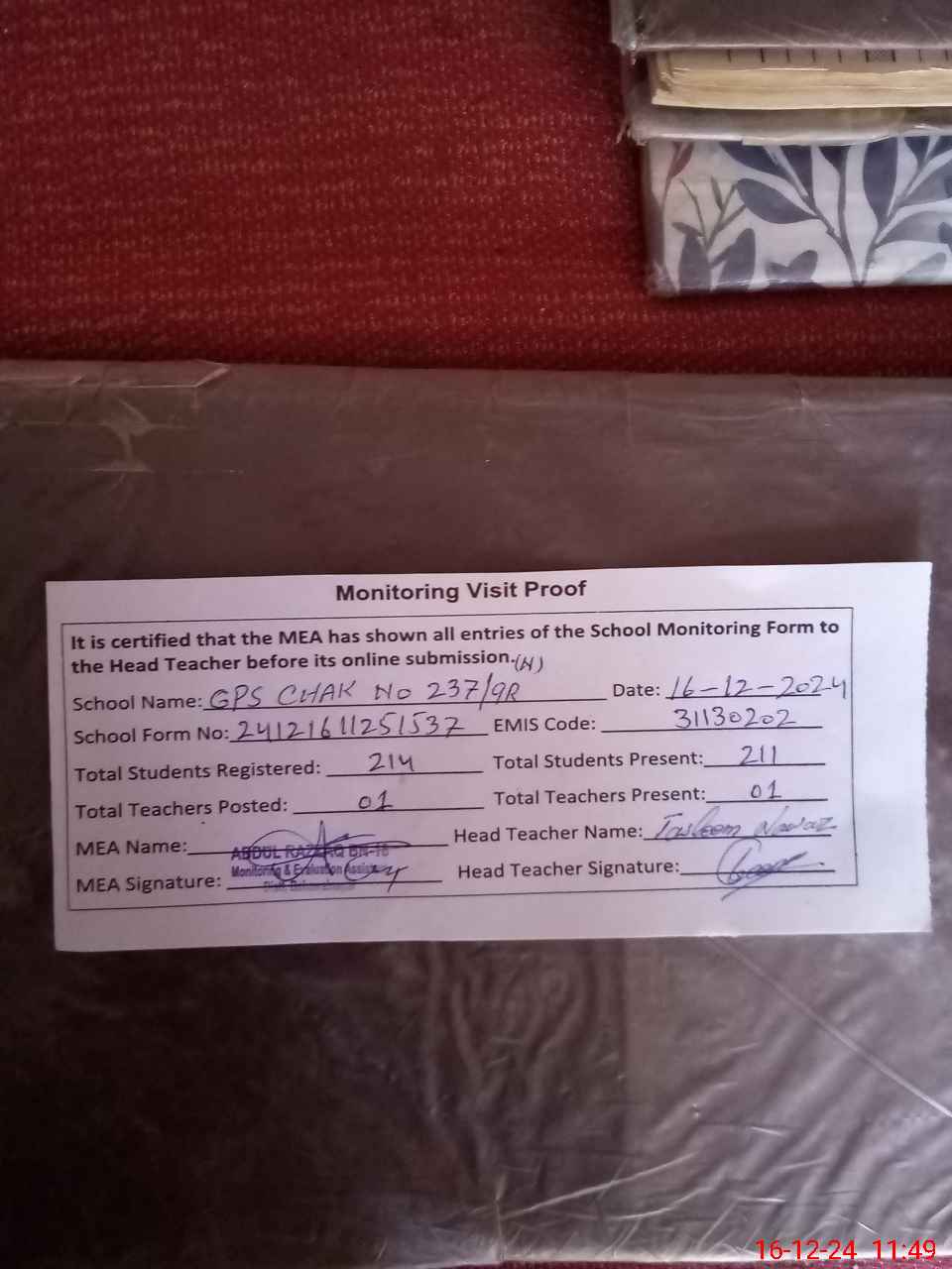 | Attendance Register | Head Teacher | MEA with School | Visit Proof |