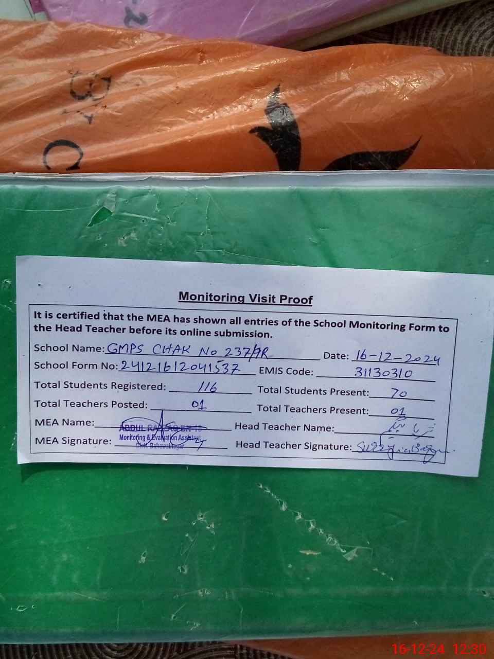 | Attendance Register | Head Teacher | MEA with School | Visit Proof |
