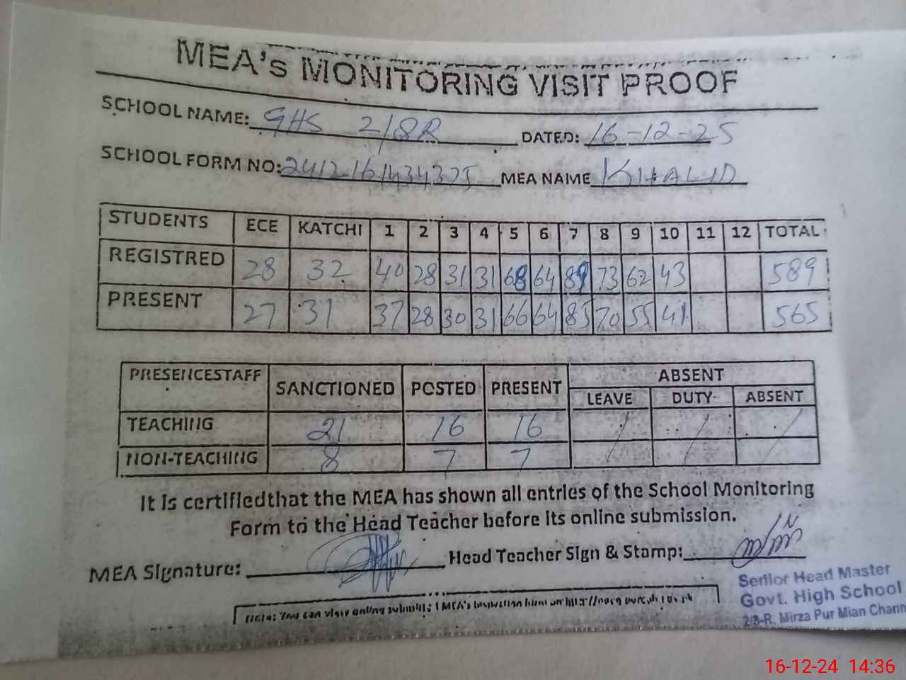 | EMIS Code: 36430028 | Name of School: GHS 2/8-R MIRZA PUR | |||