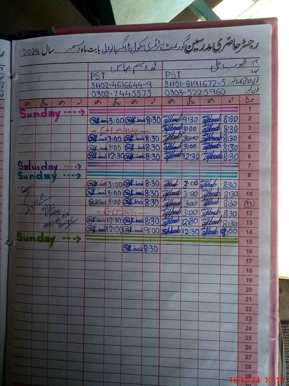 | CNIC | Full Name | Designation | R/C | Absence During Last Calender Month |
