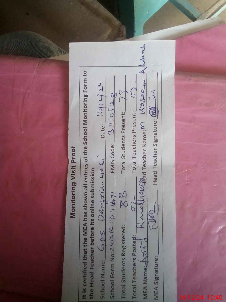 | Remarks (Use Separate Page if Required): ECCE classroom painted but class not established separately said class is being merged with nursery 2 toilets are nonfunctional due to negligently non availability of water | |||||