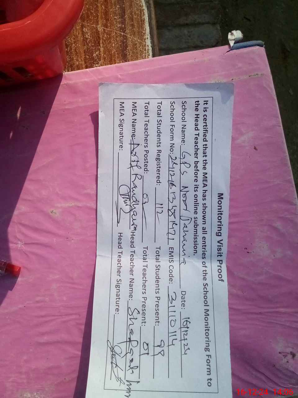 | Attendance Register | Head Teacher | MEA with School | Visit Proof |