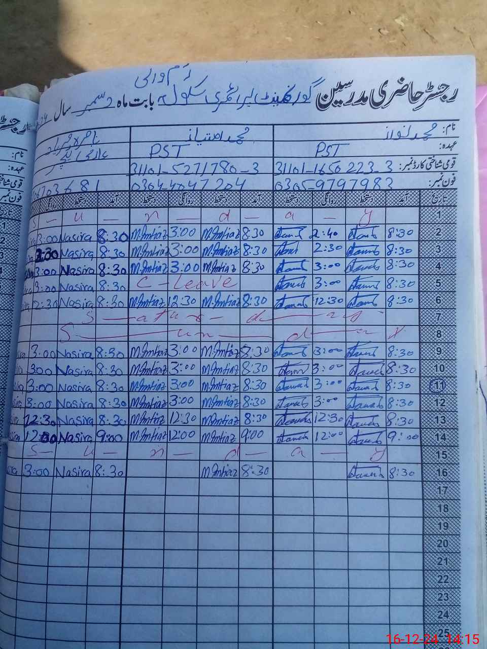 | CNIC | Full Name | Designation | R/C | Absence During Last Calender Month |