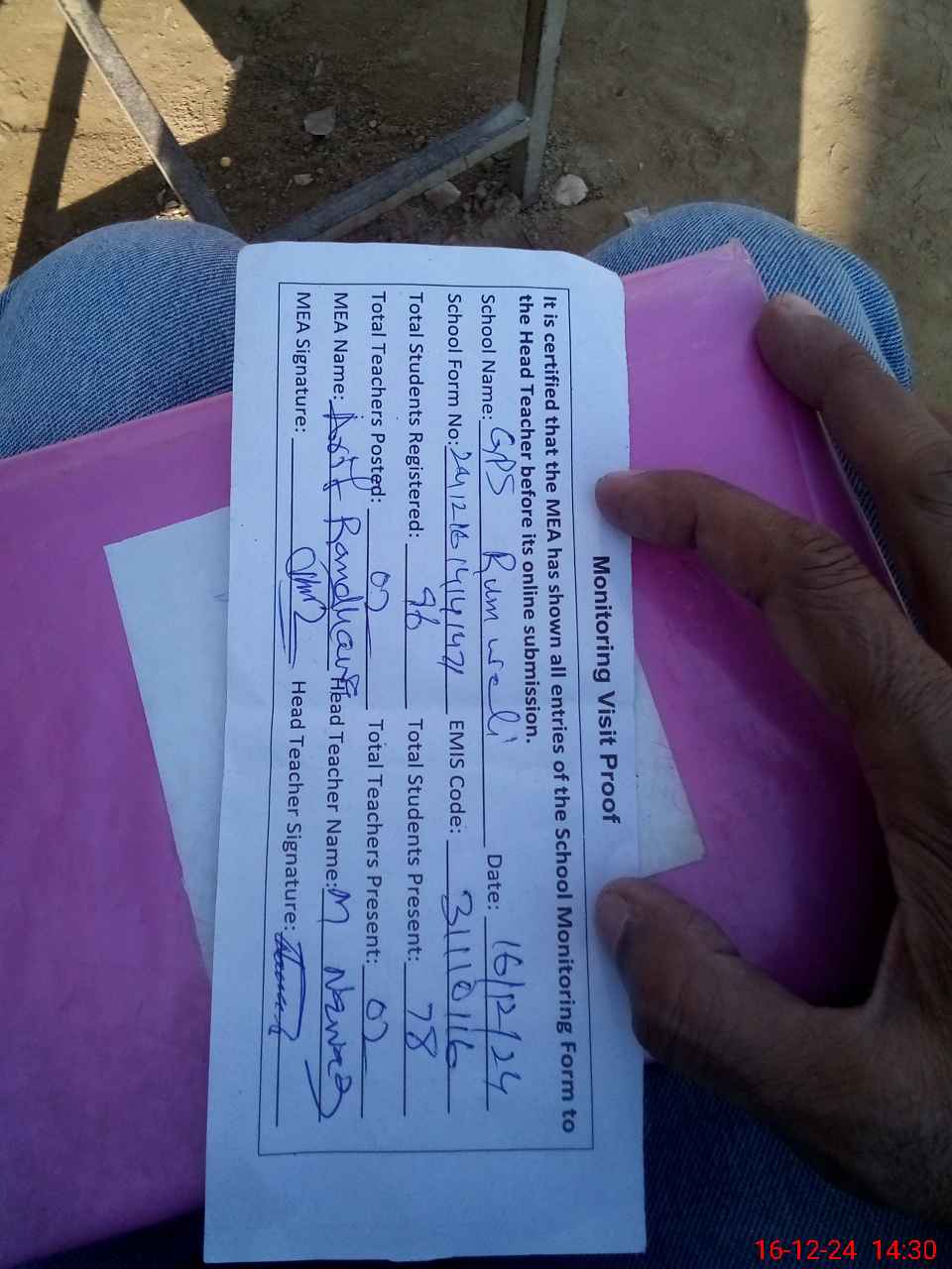 | Attendance Register | Head Teacher | MEA with School | Visit Proof |