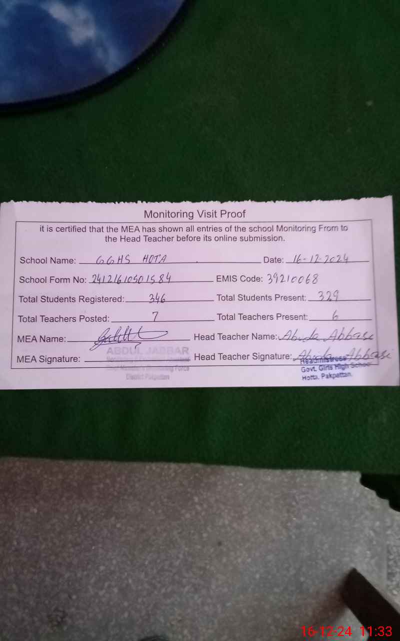 | Certified that this School was Inspected by the Undersigned MEA/DMO Today and the Information Stated Above is as Per Record. | |||||