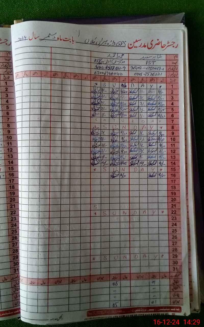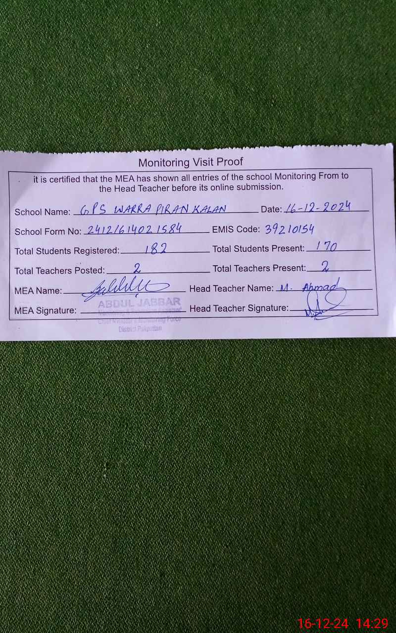| EMIS Code: 39210154 | Name of School: GPS WARRA PIRAN KALAN | |||