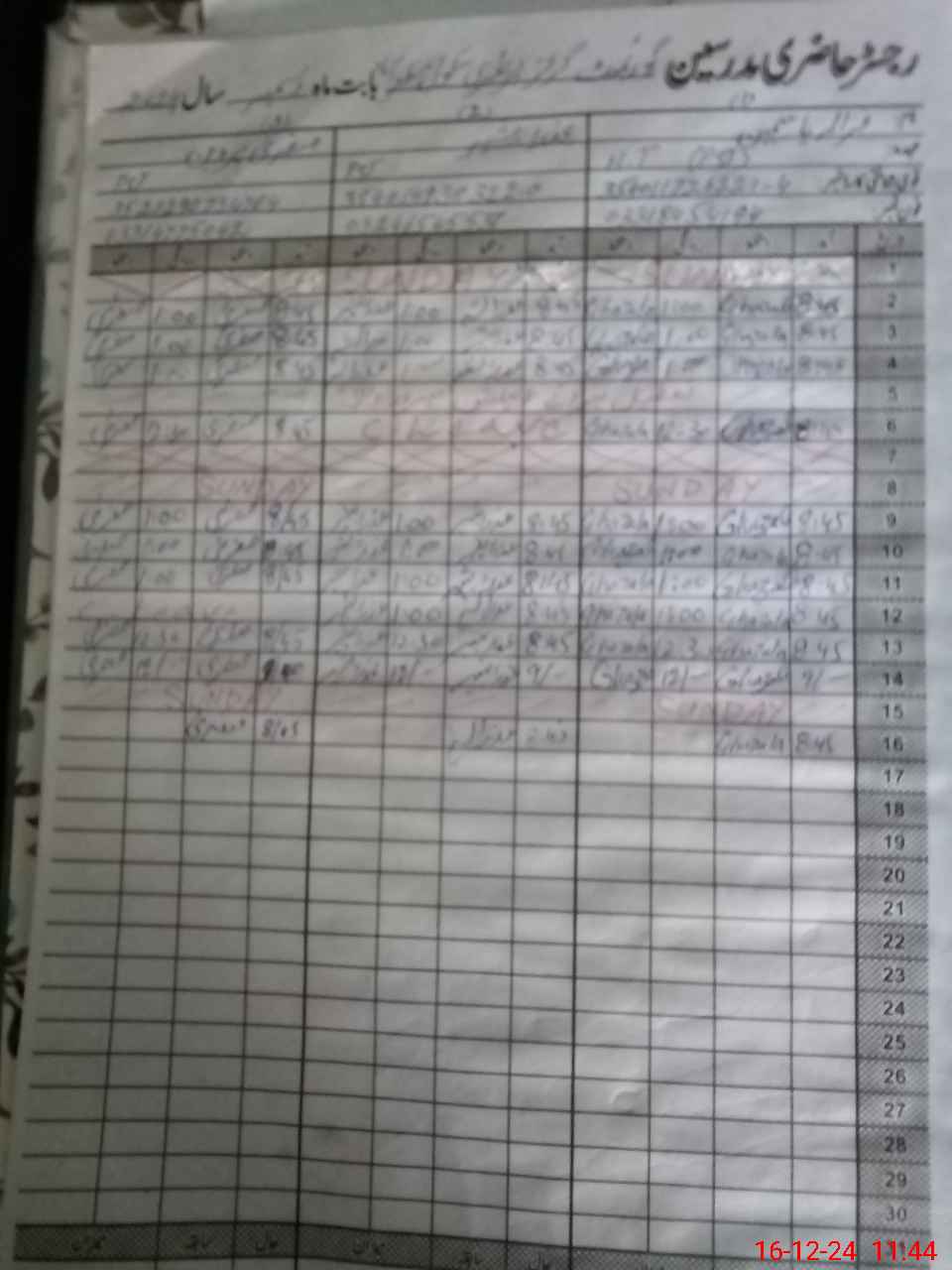 | CNIC | Full Name | Designation | R/C | Absence During Last Calender Month |