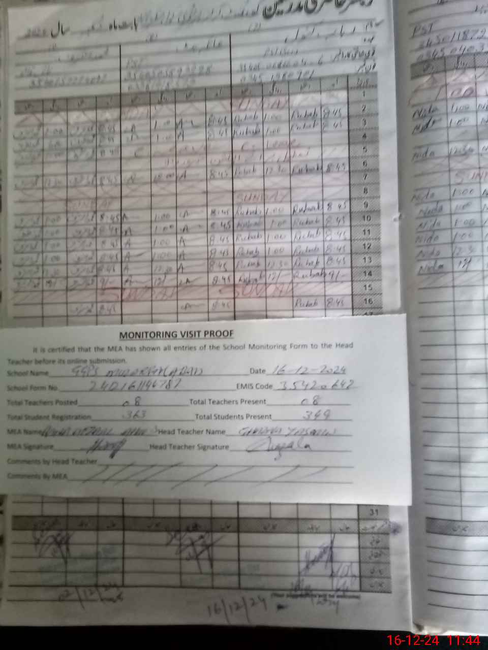 | Attendance Register | Head Teacher | MEA with School | Visit Proof |