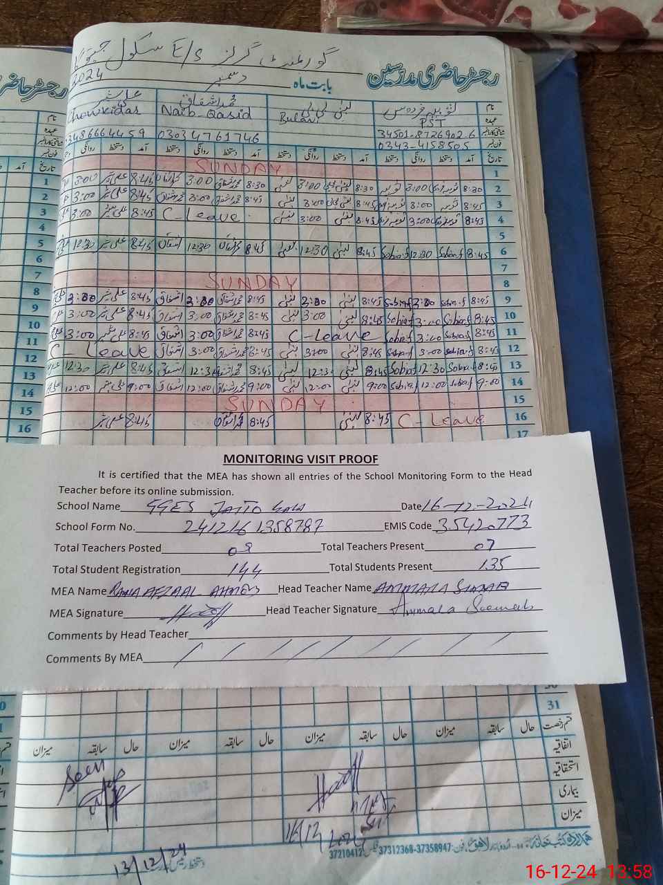 | Attendance Register | Head Teacher | MEA with School | Visit Proof |