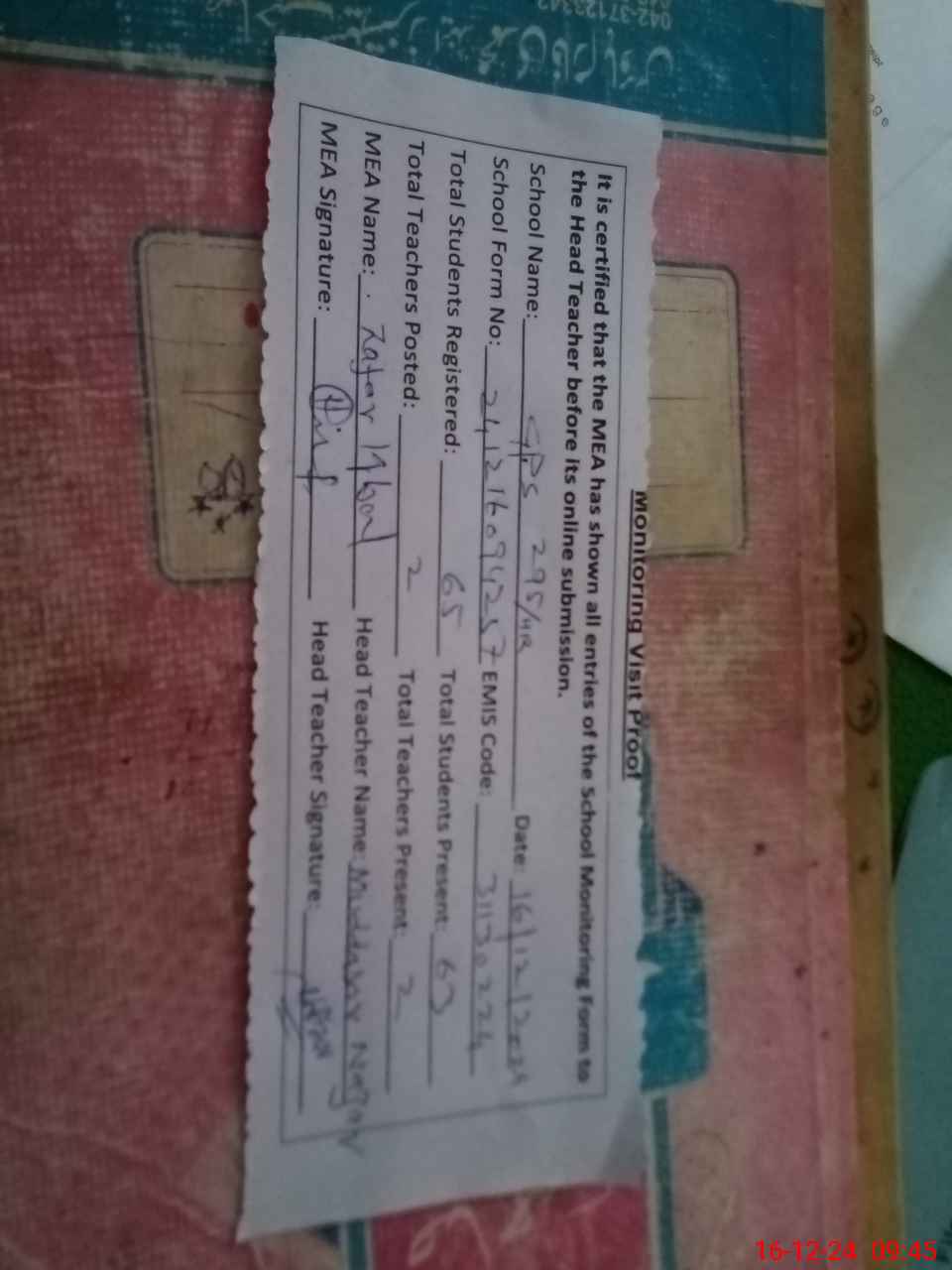 | EMIS Code: 31130224 | Name of School: GPS CHAK NO 295 HR | |||